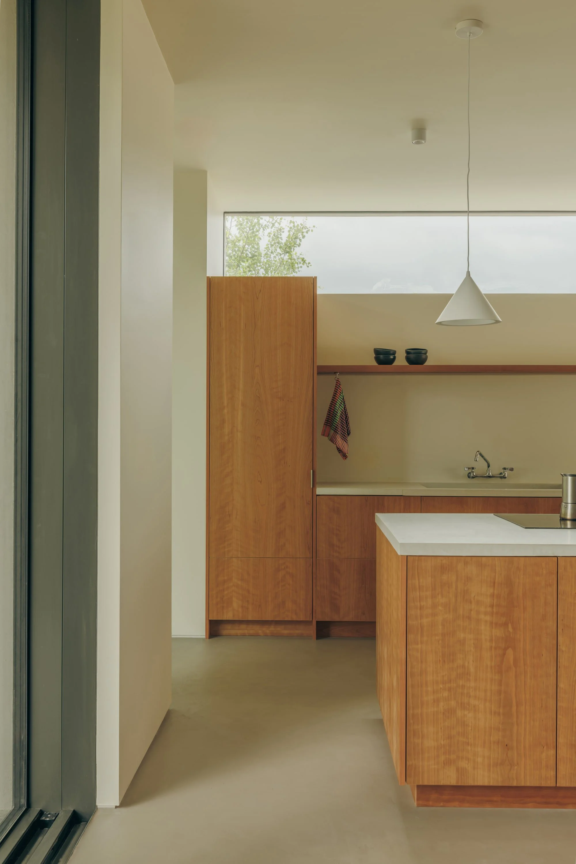 The minimal design sits precisely within the geometric plan, framed by long strip windows and full-height glazing that flood light into the space. A simple palette of American cherry, hand-cast concrete, and micro-cement flooring brings warmth and texture, while views out to the Kolumba bricks by Petersen Tegl tie the interior tones to the wider architecture.